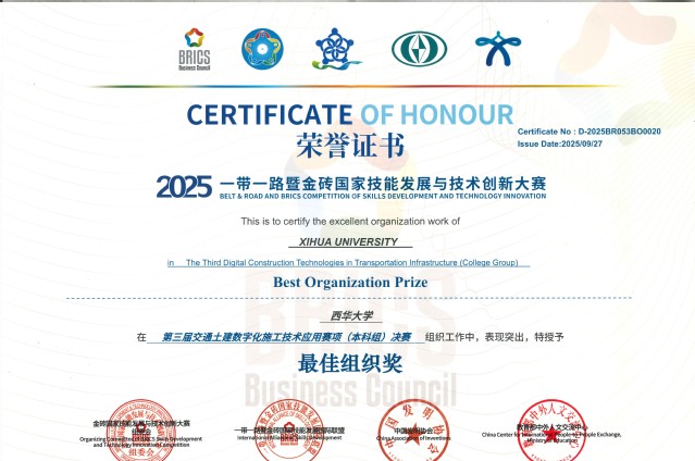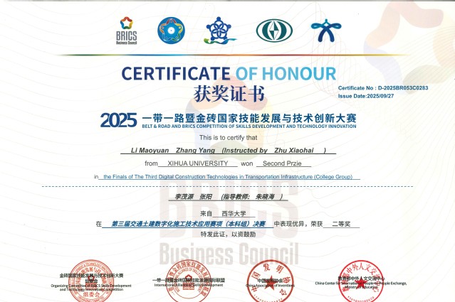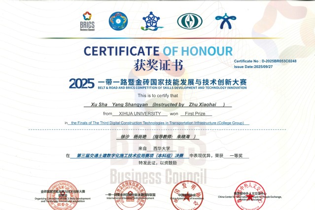 近日,教育部全国普通高校大学生竞赛榜单赛事——“一带一路” 暨金砖国家技能发展与技术创新大赛全国总决赛落下帷幕。西华大学汽车与交通学院学子在大赛交通赛项中表现亮眼,一举斩获全国一等奖、二等奖各 1 项,创下学校在该赛事中的历史最佳成绩。