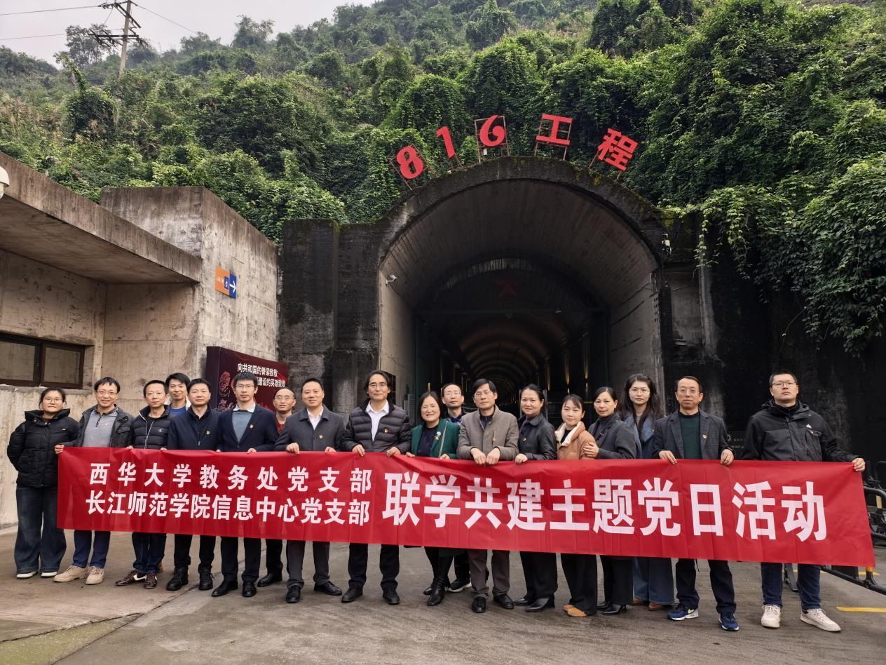 20251123日下午,学校党委常委、副校长费凌教授带领教务处、发展规划与学科建设处、信息与大数据中心部门负责人及相关人员15人,赴长江师范学院开展教育教学信息化专题调研。调研期间,西华大学团队还与长江师范学院信息中心党支部携手,共同前往重庆涪陵816地下核工程遗址,以“传承红色基因,共筑教育初心”为主题开展联学共建党日活动,在校际交流互鉴中凝聚教育发展共识,在红色精神洗礼中寻迹三线精神,共筑红色教育初心使命。